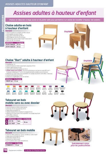 Chaises et tabourets à large assise et de petite taille pour permettre à un adulte de travailler à hauteur des enfants